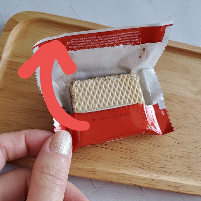 そんな時、教えてもらったのが、こちら。袋の左端と、袋の重なり部分を持って引っ張るとキレイに開きました!ウエハースも欠けてない!ポロポロこぼれる心配もない!皆さんもこの開け方で是非開けてくださいね~!
