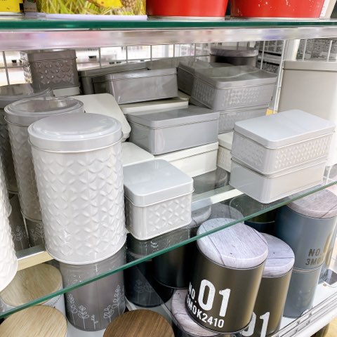 こちらのシリーズのカラーはホワイトの他にグレーがあり、色々な形の収納缶がありました!