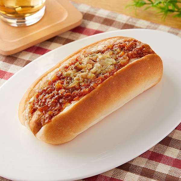 セミハードのパンに粗挽きのポークウインナーをはさみ、スパイシーで具材感あるチリソース、玉ねぎピクルス炒めをトッピングしました。