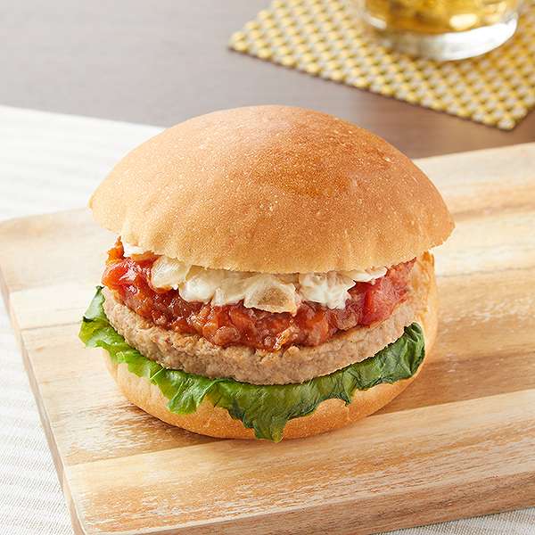 歯切れの良いバンズにパティ、ダイストマトや玉ねぎ・人参みじんの入ったミートソース、玉ねぎのマヨ和えをトッピングしたバーガーです。