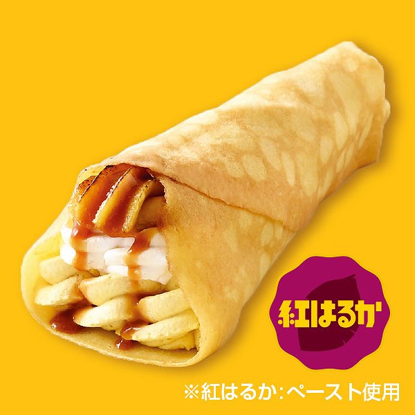 もっちりとした食感が特長のクレープ生地で、たっぷりのクリームと、表面をあぶった風味豊かで香ばしいスイートポテトを包みました。