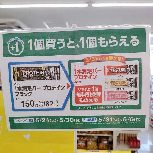 「アサヒ 1本満足バー プロテインブラック」いずれか1個を買うと「アサヒ 1本満足バー プロテイン チョコ」「アサヒ 1本満足バー プロテイン ホワイト」「アサヒ 1本満足バー プロテイン ストロベリー」いずれか1個の無料引換券もらえる!