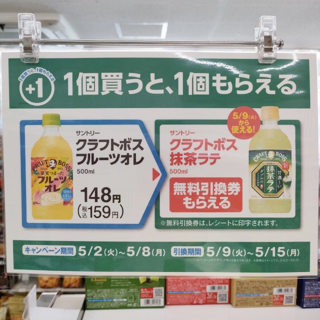 「サントリー クラフトボス フルーツオレ 500ml」を買うと「サントリー クラフトボス 抹茶ラテ 500ml」の無料引換券がもらえる!