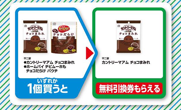 「不二家 カントリーマアム チョコまみれ/ホームパイ チビムーホも チョコだらけ パウチ」いずれか1個を買うと「不二家 カントリーマアム チョコまみれ」の無料引換券がもらえる!