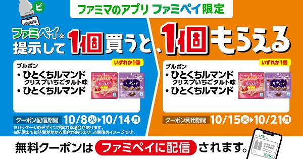 期間中、ファミマのアプリのバーコードをスキャンして「ブルボン ひとくちルマンド クリスプいちごタルト味/ひとくちルマンド 各47g」いずれか1個を買うと、「ブルボン ひとくちルマンド クリスプいちごタルト味/ひとくちルマンド 各47g」いずれか1個に使える無料クーポンがもらえる!