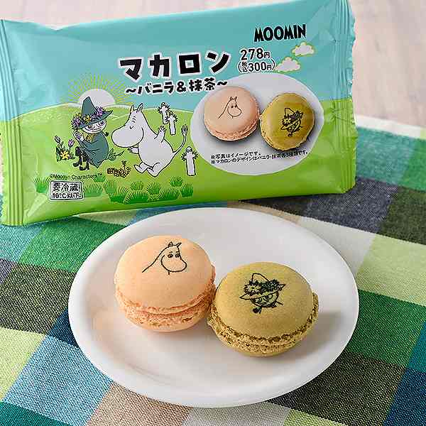 バニラ味と抹茶味のマカロンです。マカロンのキャラクターイラストは全6種(バニラ3種・抹茶3種)です。