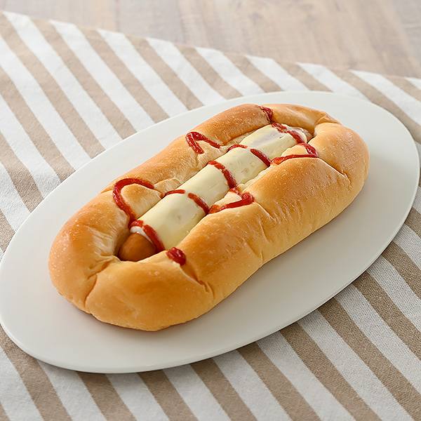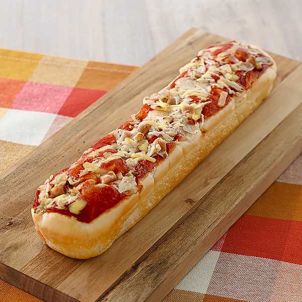 完熟トマト使用のピザソースを塗り、スライスオニオン、ベーコン、シュレッドチーズをトッピングした、食べやすいスティック形状の惣菜パンです。