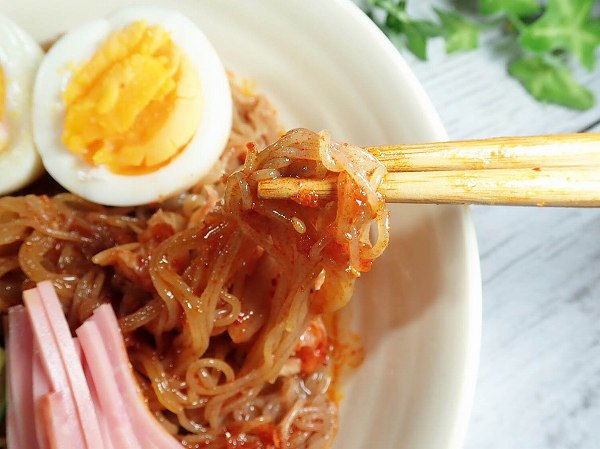 水気を切った麺を器に盛って、ビビン冷麺の特性ダレを絡めて完成♪