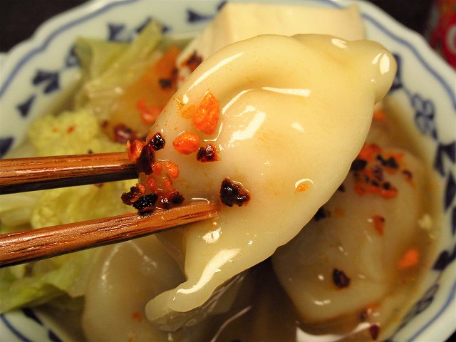 ごく一般的な鍋の具材と冷凍の水餃子を入れて、そこに食べる具だくさんらー油をトッピング♪
