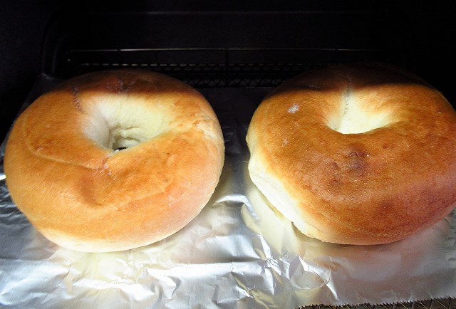 - 予熱したオーブントースターで、凍ったままのベーグルを薄いきつね色になるまで約3分焼く