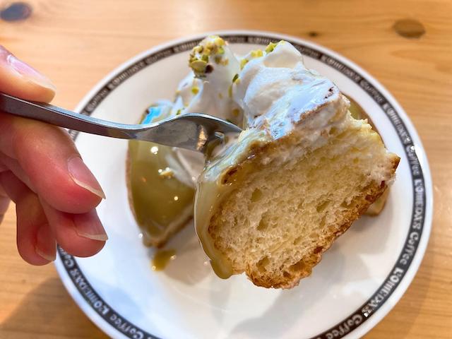 ピスタチオペーストはデニッシュパンを覆うようにたっぷりとかかっているので、最後まで飽きずに食べられそうですね!