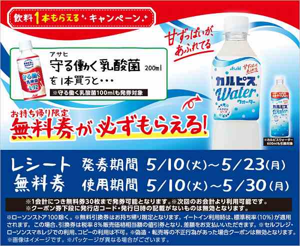 「アサヒ 守る働く乳酸菌 200ml 138円(税込)※アサヒ 守る働く乳酸菌 100mlも対象」を買うと、「アサヒ カルピスウォーター 500ml 151円(税込)※アサヒ カルピスウォーター 600mlも対象」と交換できる無料クーポンがレシートについてきます。