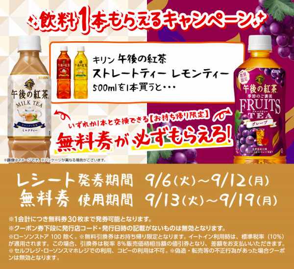 「キリン 午後の紅茶 ストレートティー/レモンティー 500ml 各151円(税込)」を買うと、「キリン 午後の紅茶 ミルクティー/季節のご褒美 FRUITS TEA グレープ 500ml 各151円(税込)」と交換できる無料クーポンがレシートについてきます。