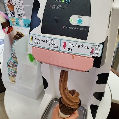 アイスクリームのゴディバのカードをレジに持っていき、お会計をしたあと、アイスクリームを受け取り、機械にセットして自分でソフトクリームを作るんですよ!!