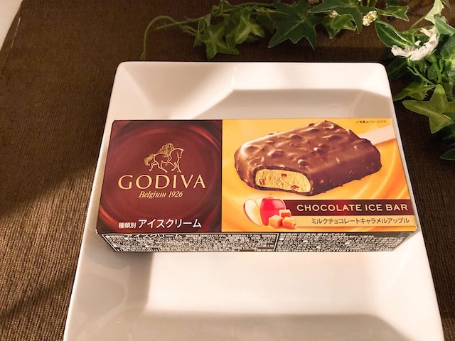 今回ローソンから新登場していたのはゴディバの「ミルクチョコレートキャラメルアップルバー」です!