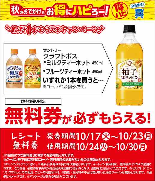 「サントリー クラフトボス フルーツティー ホット 450ml 143円(税込)/クラフトボス ミルクティー ホット 450ml 150円(税込)」いずれか1本を買うと、「サントリー クラフトボス 柚子はちみつティー 600ml 149円(税込)」と交換できる無料クーポンがレシートについてきます。