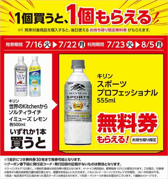 「キリン iMUSE レモン/世界のキッチンからソルティライチ 各500ml 165円(税込)」いずれか1本を買うと、「キリン スポーツ プロフェッショナル 555ml 149円(税込)」と交換できる無料クーポンがレシートについてきます。