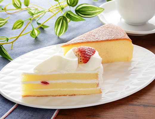 口どけの良いクリームを使用し、苺スライスをサンドした苺のショートケーキと、北海道産チーズを使用したふんわりとしたスフレチーズケーキを組み合わせています♪