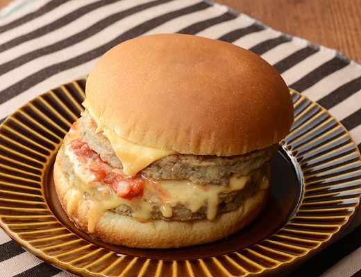 ハンバーグパティ2枚、熟成チェダー入りチーズ2枚をサンドし、ピクルスと玉葱入りケチャップを合わせました。