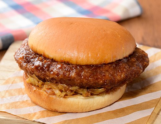 はみ出るメンチカツをキャベツとソースで楽しむバーガー。