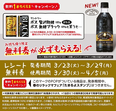「サントリー ボス 無糖ブラック 185g 123円 」もしくは「サントリー ボス 贅沢微糖 185g 123円 」を購入すると、