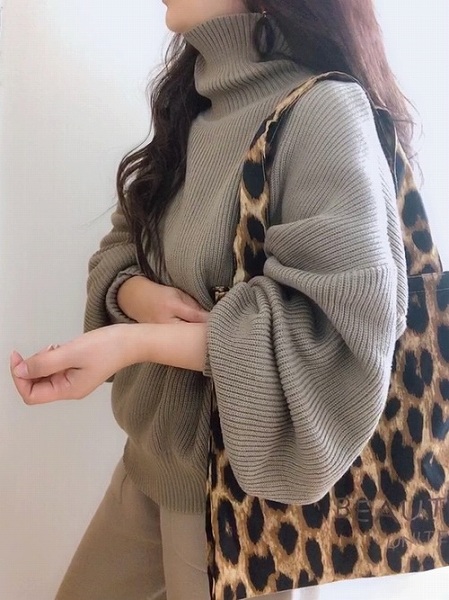 ルーズなニットに全体的に柔らかいカラーでまとめ、レオパード柄で引き締めたハイセンスコーデ。
