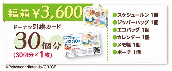 ピカチュウ・カビゴン・ソーナンス・ヌオー・ホゲータ・ヌメラなどがデザインされたミスド福袋オリジナルグッズと、ドーナツ引換カードがセットになっています!