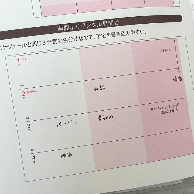 週間スペースも3分割の色分けになっていて、書き込みのスペースもとても広い!
