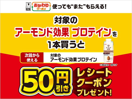 期間中、50円引きレシートクーポンを使って対象のアーモンド効果 プロテインを購入した場合でも、新たな「50円引きレシートクーポン」が発券されます!