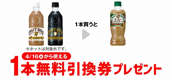 「サントリー クラフトボス ラテ/ブラック 各500ml」いずれか1本買うと、「サントリー クラフトボス 甘くないイタリアーノ 500ml」1本無料引換券がプレゼントされます!