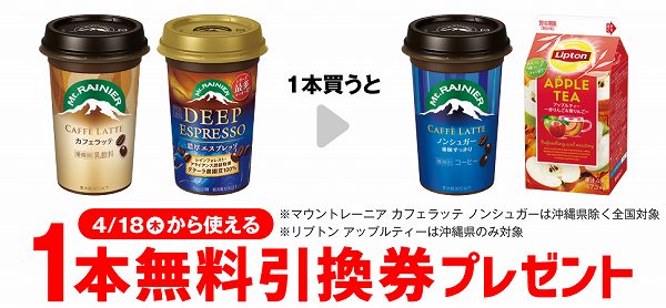 「マウントレーニア カフェラッテ/ディープエスプレッソ 各240ml」いずれか1本買うと、「マウントレーニア カフェラッテ ノンシュガー 240ml/リプトン アップルティー 473ml」1個無料引換券がプレゼントされます!