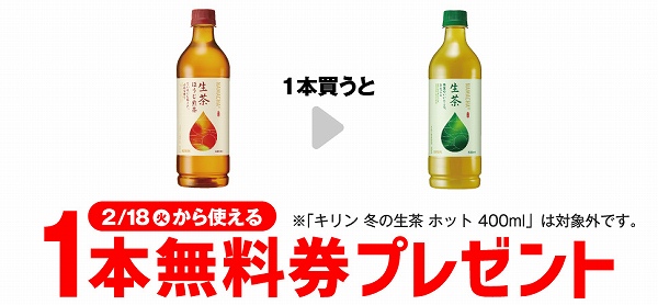 「キリン 生茶 ほうじ煎茶 600ml」1本買うと、「キリン 生茶 600ml ※「キリン 冬の生茶 ホット 400ml」は対象外」1本無料引換券がプレゼントされます!