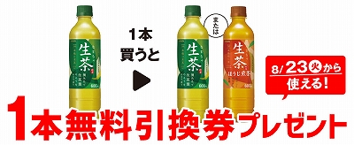 「生茶 600ml」を1本買うと、「生茶 600ml」または「生茶 ほうじ煎茶 600ml」1本無料引換券がプレゼントされます!