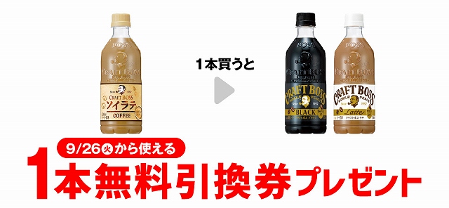 「サントリークラフトボス ソイラテ500ml」を1本買うと、「サントリークラフトボス ブラック500ml」「サントリークラフトボス ソイラテ500ml」いずれか1本無料引換券がプレゼントされます!