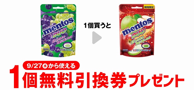 「クラシエメントスDUOグレープ&マスカット」を1個買うと、「メントスDUOレッド&グリーンアップルソーダ」1個無料引換券がプレゼントされます!