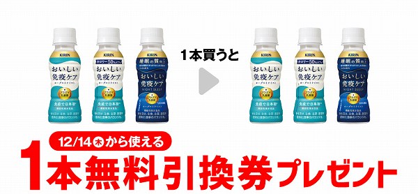 「おいしい免疫ケア/おいしい免疫ケアカロリーオフ/おいしい免疫ケア睡眠 各100ml」いずれか1本を買うと「おいしい免疫ケア/おいしい免疫ケアカロリーオフ/おいしい免疫ケア睡眠 各100ml」いずれか1本と交換できる無料引換券がもらえる!