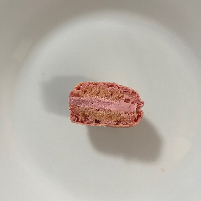 マカロン独特の噛んだ瞬間の優しい食感と後からくるサクサクした食感、そして苺の爽やかな甘酸っぱさがおいしいです!