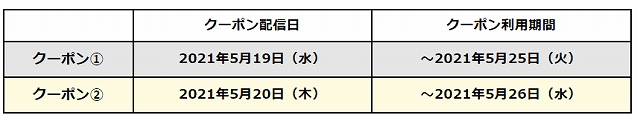 クーポンの利用期間はそれぞれ2021年5月25日(火)2021年5月26日(水)です。