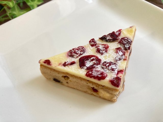 クランベリー、ホワイトチョコチャンク、オレンジピール、スパイスなどを混ぜ合わせた生地の上に、クリームチーズ・ホワイトチョコレート・オレンジピールを混ぜたクリームを重ね、仕上げにクランベリーと粉糖をトッピングしたこだわりのあるスイーツとなっています!
