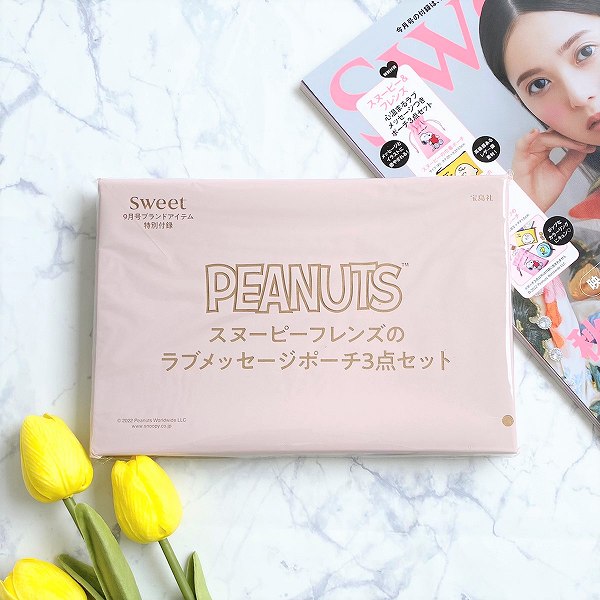 『sweet』2022年9月号の特別付録は、「スヌーピー&フレンズ心温まるラブメッセージつきポーチ3点セット」です!
