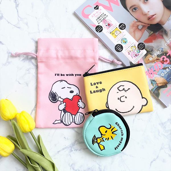 開封すると、スヌーピーと仲間たちとメッセージがデザインされたミニポーチが3点の付録です。
