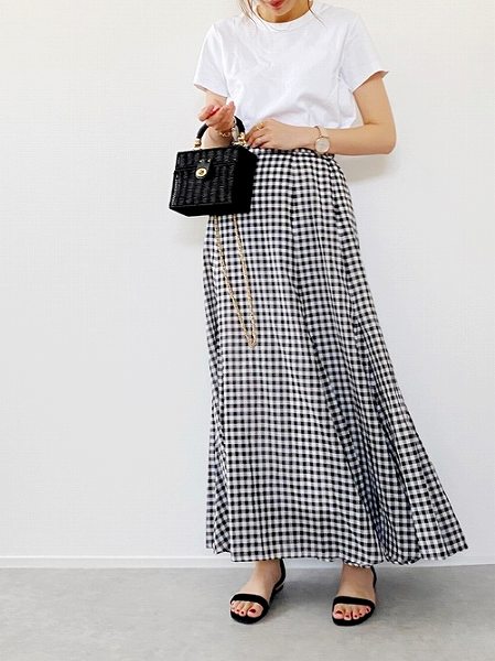 「スカート×Tシャツ」女性らしいアイテムにカジュアルさをプラスすることで、こなれ感たっぷりなスタイリングに。