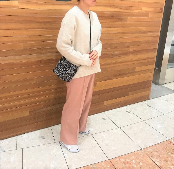 ユニクロのライトスフレヤーンリラックスクルーネックセーターにハイウエストワイドパンツを合わせて。