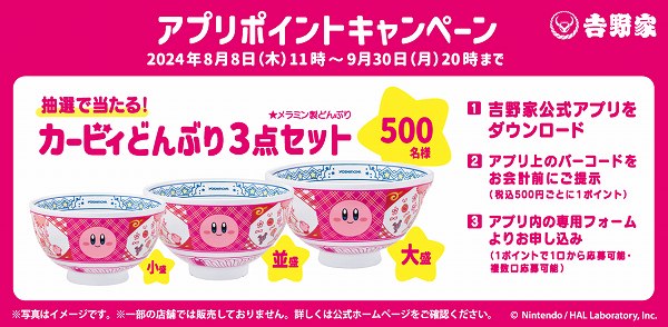 なんと抽選で500名に、『カービィどんぶり3点セット』(小盛・並盛・大盛の3点/メラミン製)が当たります!
